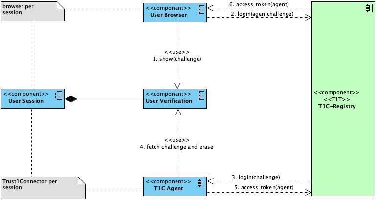 The application shows this code word on screen and provide a button for 'copy-to-clipboard'. When the user has copied the code word to the clipboard (on user click button event), an implicit consent request can be executed towards the T1C. The T1C will grab the pasted code word from the user system clipboard and if both match, an implicit user consent has been granted for the calling application. The relation between the application and the local T1C instance is 'approved'. At this point the Trust1Connector returns a verified consent object that is stored in the browser's localstorage. This object is used to validate the consent and retrieve the necessary information for the Trust1Connector to function. This object will be re-used the next time the user wants to use the Trust1Connector until the consent expires.